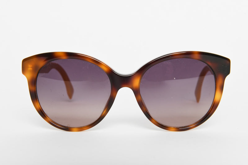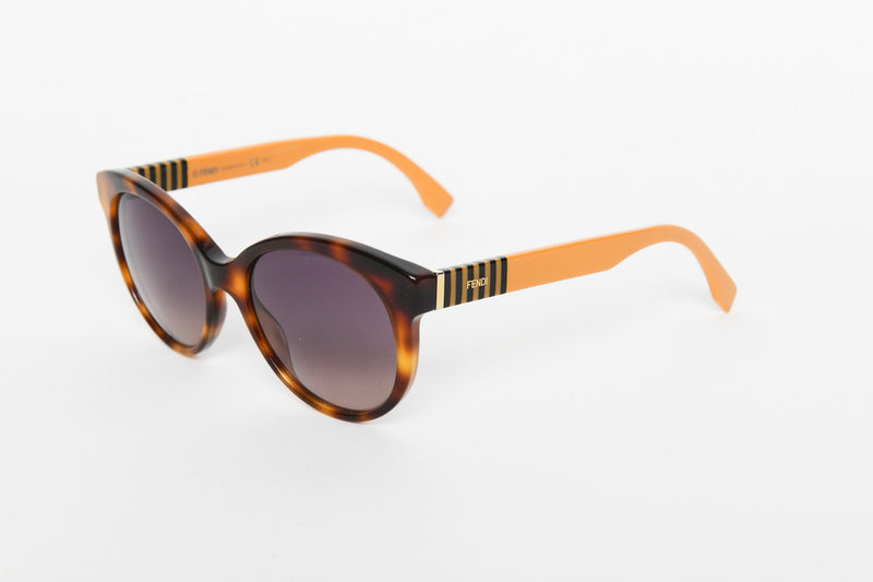 Ladies, beautiful “Fendi” designer sunglasses, in a lovely brown mottle with mustard coloured arms with a black/mustard striped detail. 52/24. Small/Medium.